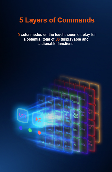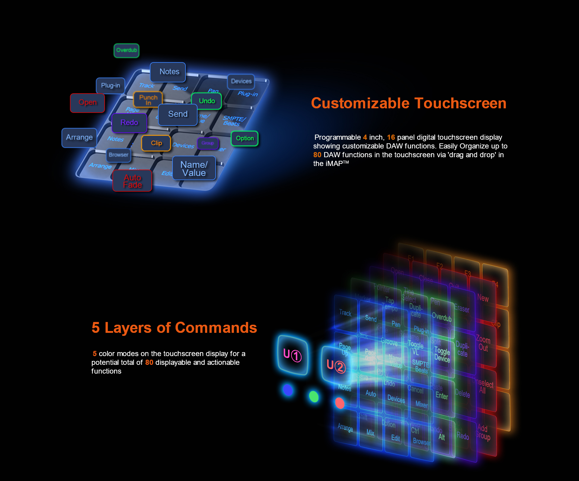 - 3cm x 13.3cm大总共16格的轻触液晶显示屏,以5种颜色页提供高达80种支持用户自定义成为数字音频工作台(DAW)的功能和指令