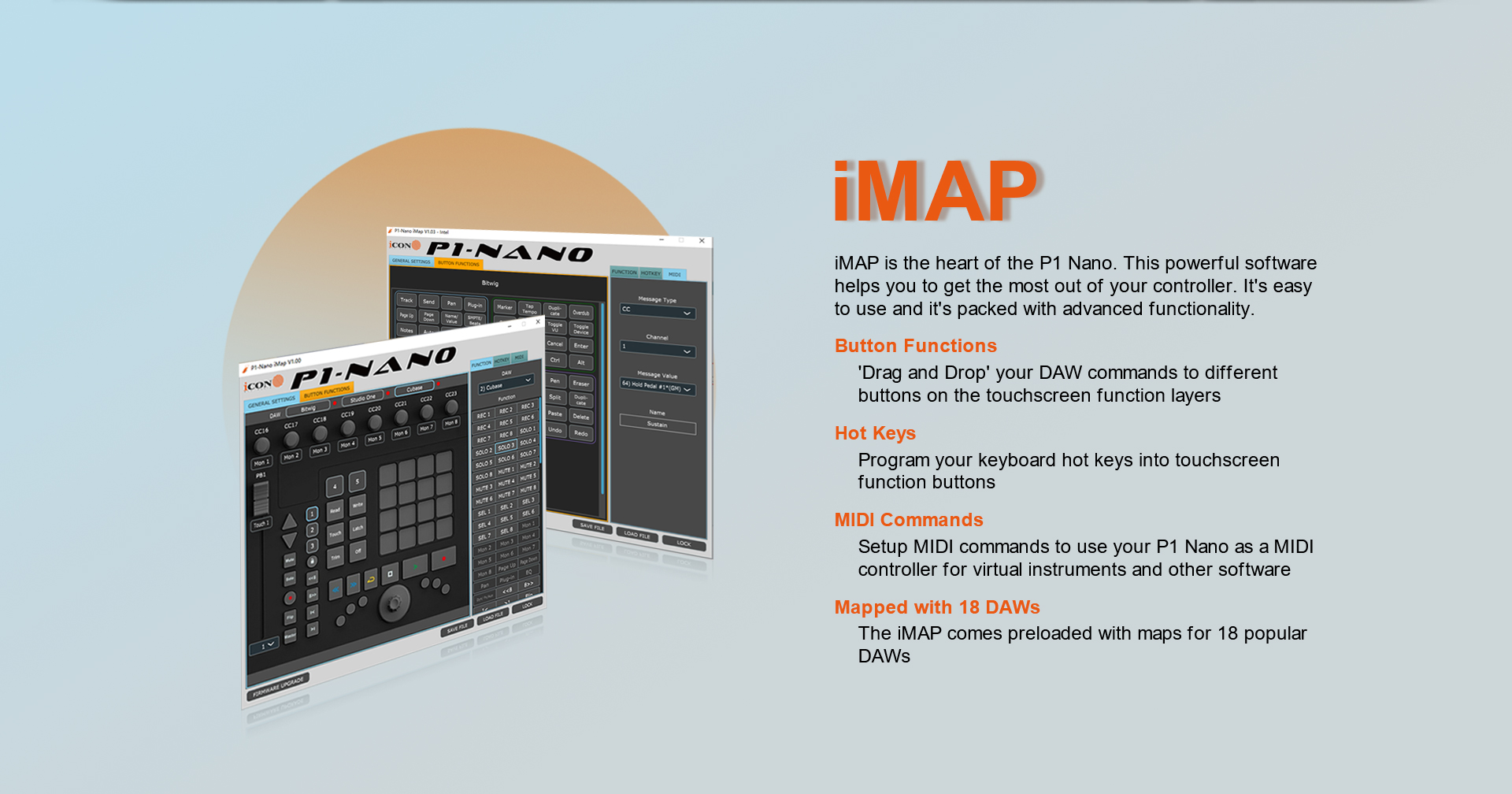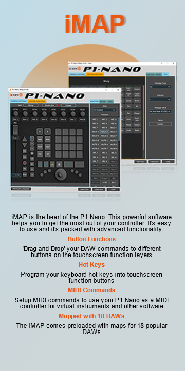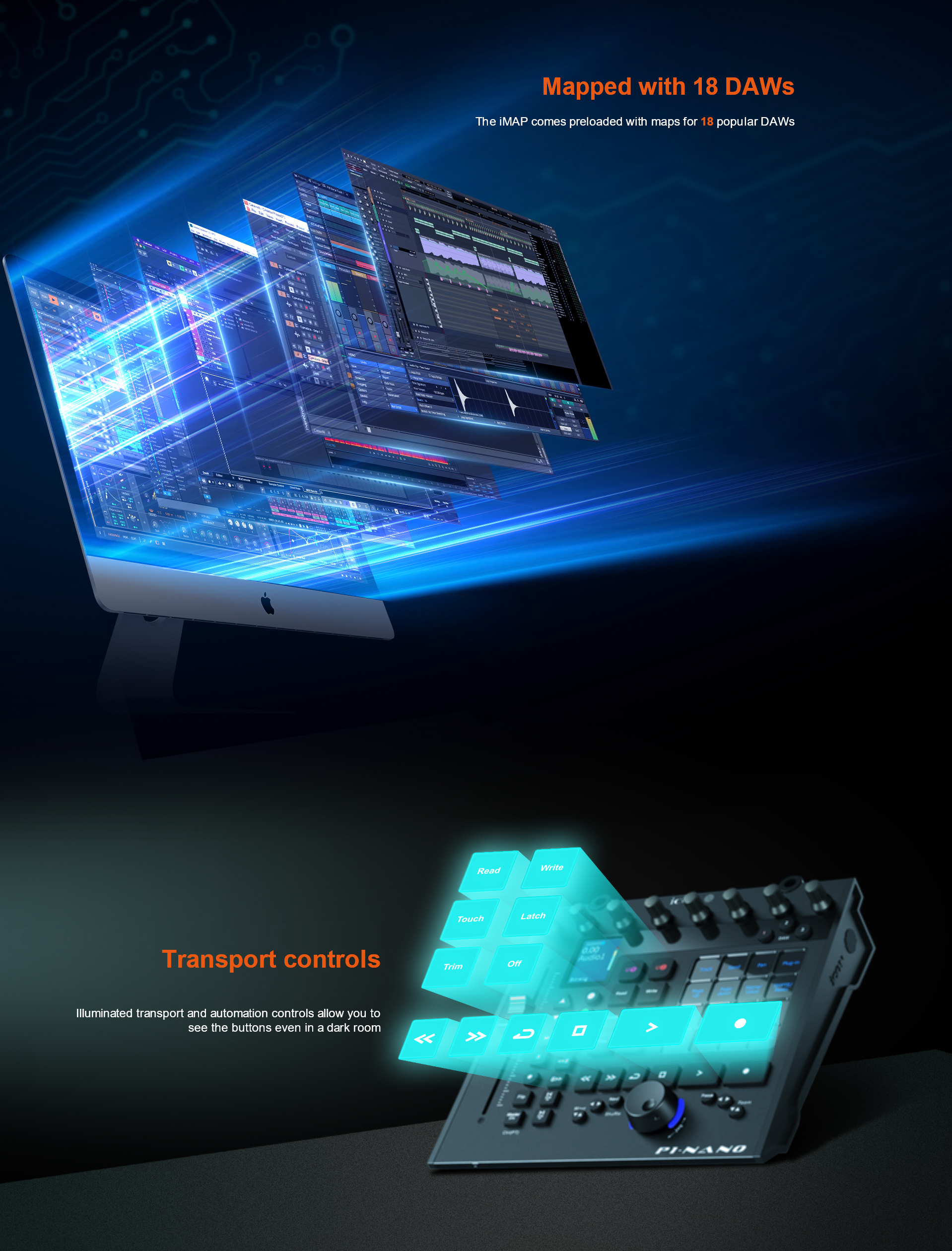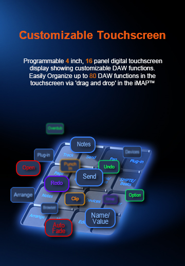 - 在iMAP软件简单拖曳即可整理控制器上16个轻触液晶显示屏的在DAW里的功能和指令