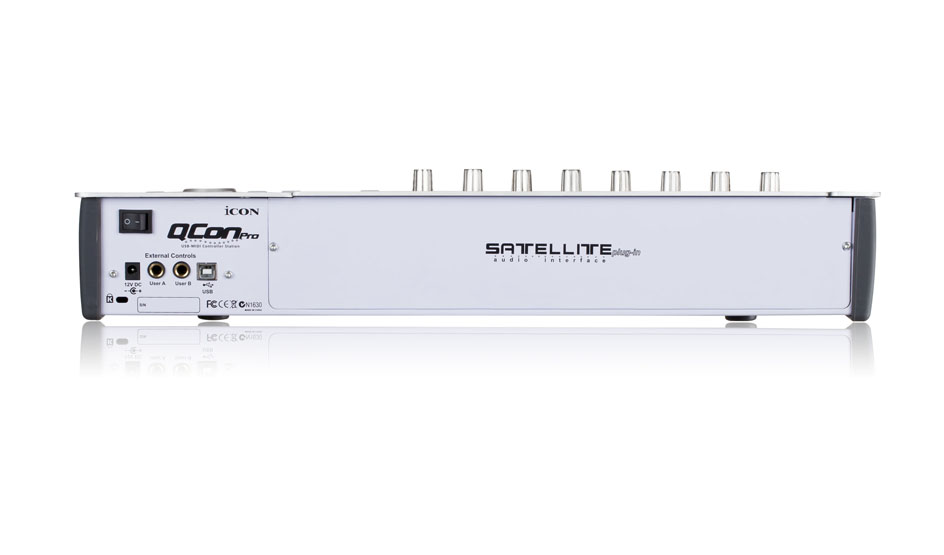 显示屏后面是一个用于 Icon UMIX1008 卫星音频接口的扩展端口。将你的 QCon Pro 转变为一个完整的 24 位 / 192KHz 基于 DAW 的录音工作站,配备 8 个带增益控制和幻象电源的模拟 XLR/TRS 麦克风 / 乐器 / 线路输入、6 个模拟 TRS 输出以及 S/P DIF 输入和输出。连接 UMix 1008 时,QCon Pro 正面还有两个耳机输出端口可供使用。