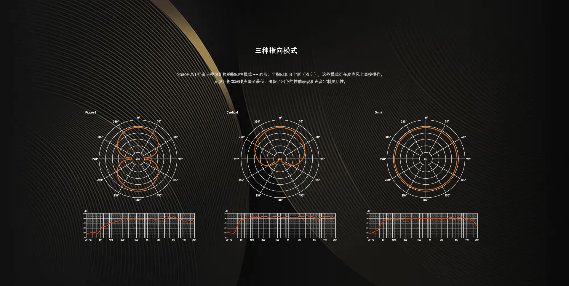 Space 251 配备三种可切换的指向性模式 —— 心形、全指向和 8 字形(双向),可通过电源装置进行选择。其精心设计的电路能将底噪降至最低,确保为您的创作捕捉到纯净无瑕的音频。