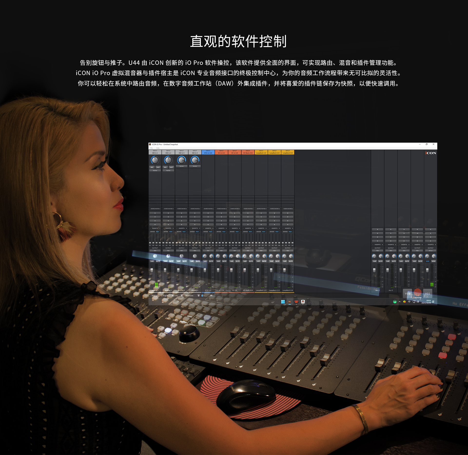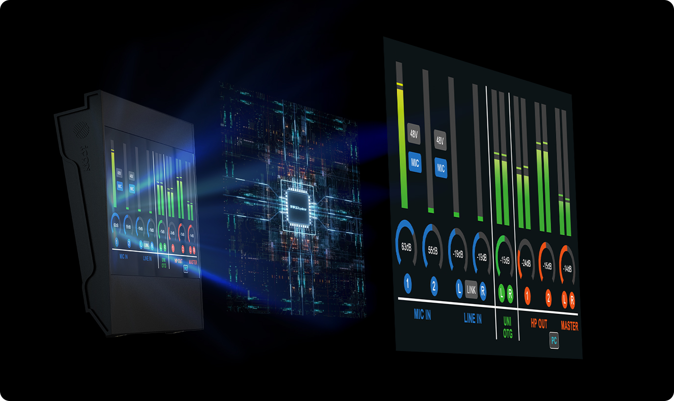 iCON iO Pro 软件控制,并显示在 7 英寸大尺寸、易读的 TFT 屏幕上。这个先进的虚拟混音器和插